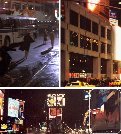 Now getting back to the identification of the Ghostbusters II theater ghost shot... We have one last connection to make. On the left of the movie shot - until that damn bus parks in front of it - you see a white building with uniformly rectangular windows and an odd-looking sculpture of some sort in front of it. That building is One Broadway Place, located at 1540 Broadway, which was under construction at the time the movie was filmed (it was completed in 1990). That odd-looking sculpture is some sort of decorative construction used to advertise the place, as well as maintaining the safety of the site. In the set of photos below, the movie shot is on the top left, a shot of the building shortly after it was finished in the early 1990s is on the top right (taken by Roger W. Hicks), and a wide shot of Time Square at night in 1989 looking north with the decorative construction seen on the right is on the bottom (taken by Frank Picard). The bottom image is the only good photo of the building with that decorative construction in front of it that could be found online, and as you can see, it's taken from the opposite angle, so it might be hard for you to see that it's a match. You can click on it to see the full-size image, in which you can clearly see the Marquis marquee advertising Me and My Girl, the Canon billboard, the Burger King, the Suntory Whisky sign, the Diet Coke sign, the Batman sign (though it's mostly hidden), the Foster's sign, the Panasonic sign, AND even some McDonald's signage, I think all of that proves that that's the correct building. Really, are you gonna doubt me at this point in the article?!?