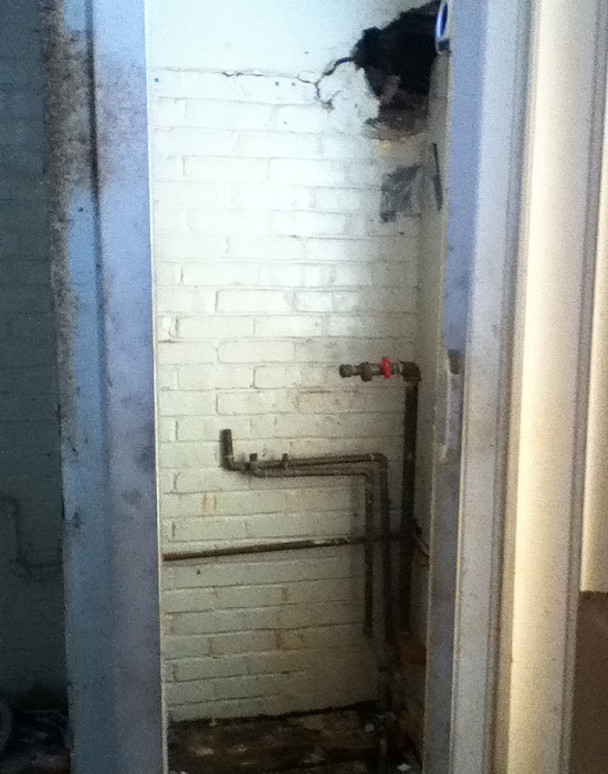 Since the front door hasn't worked since mid-November 2012 (it's swelled shut), I have to go in through the back entrance. That makes the kitchen and the make-shift "boiler room" contained therein the first room I see upon entering. I was rather surprised to find that the gas heating unit was no longer there.