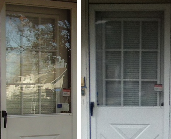 I didn't notice this on location, but as I was looking through photos to make the above comparison, I noticed that someone removed the American flag sticker that was on the front screen door window in the lower right corner. I don't know why anyone would bother to peel it off. It was old, color faded, and probably didn't come off easily.