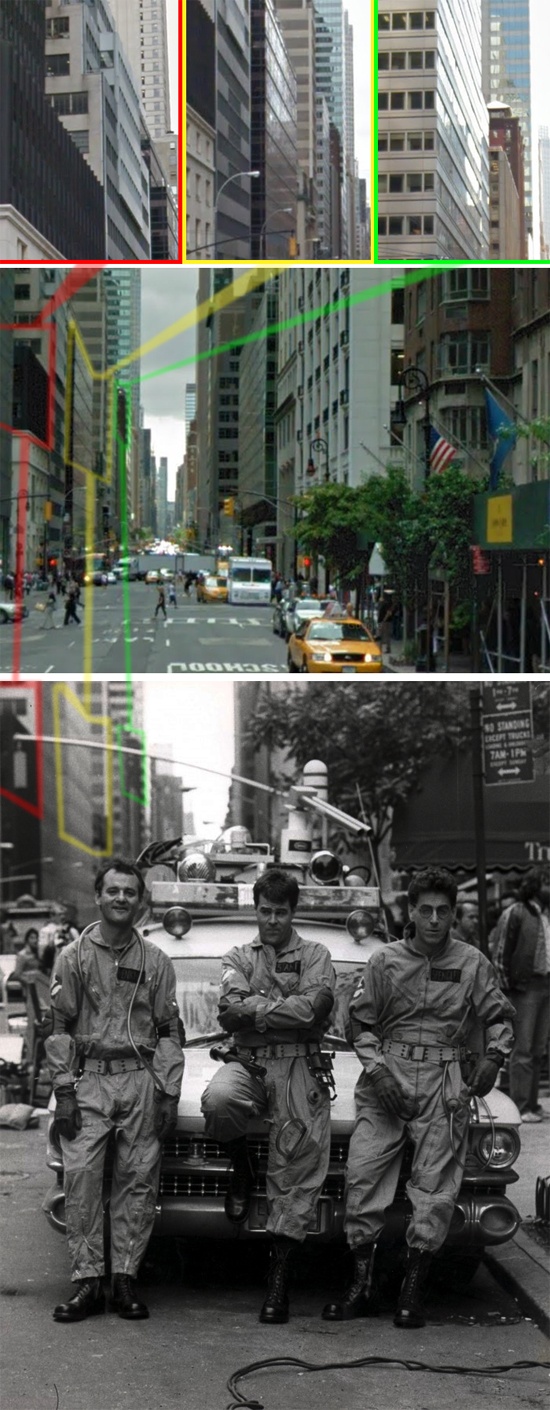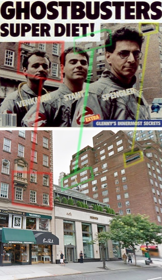 This shows three points that identify the Globe magazine cover. The red selected area above Peter shows the same ornate window to the left. The selected green area near Ray shows the same six windows and that odd smaller window facing the main street. The yellow selected area near Egon shows a rather weird indented part of the same building behind Ray. Again, it should be pointed out that this shot is basically the same as the Time magazine cover and promo photos, except the camera has turned about 45 degrees to the left.