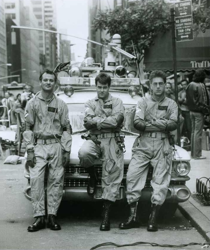 Noted in the background of that shot is a place clearly marked as "Truffles Cafe". After some dead ends and a few false leads, I found out that the restaurant was located at 696 Madison Avenue. Before I had that piece of information, I was searching on Madison Avenue because I had a false suspicion that a Ghostbusters II location could have been shot there. I was looking for something to work from and I thought if the Undead Taxi Driver and Ray with Trap locations happened to be so close together, maybe the location scout also used it again in the second film. I ended up finding this image, and when I saw it, I couldn't help admiring the tall buildings in it. Instantly, Ghostbusters (the first movie) came to mind. Specifically, the promo photos of the three guys in front of the Ecto-1.