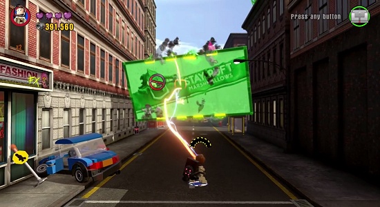 The Starter Pack's Ghostbusters level is the 9th one in the story, and is entitled "The Phantom Zone". Batman, Wyldstyle, and Gandalf go through the streets of New York en route to the Ghostbusters firehouse headquarters. When they get there, they must find a way from the garage bay into the basement, and finally onto the roof where they fight Superman villain General Zod. I was pleasantly surprised to find a whole bunch of little and big nods to Ghostbusters in the level, some only die-hard Ghostheads would get. There's a theater showing "Ghost Smashers" (the original title for the movie), the subway and theater ghosts show up, as does a ghostly mailbox reminiscent of the talking mailbox in The Real Ghostbusters episode "Mr. Sandman, Dream Me a Dream". You'll pass by the slime-covered museum and the Shandor Building (with a doorman inside waiting to be mind-controlled by Wonder Woman), while the Statue of Liberty stomps past "Ray's Bookstore" (no "Occult" due to kids being in the target audience). There are Ghostbusters and Stay Puft Marshmallow billboards here and there, and LOTS of pink slime all over the place. Even Slimer makes a cameo, much to the chagrin of Gandolf. The collectible minikits in the level are mini containment units, though only three of the ten can be obtained with the starter pack characters.