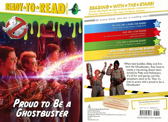 June 14th sees the release of Proud To Be A Ghostbuster by David Lewman, a children's book based on the new Ghostbusters movie. It's part of the Ready-to-Read series, classified at Level Three/Megastar Reader, which indicates that it features a "larger, more complex story plot and character development; challenging vocabulary words, and a more difficult sentence structure". The 6"x9" paperback tome is printed with a large font on plain paper stock and is suitable for the 6-8 year old age range (school grades 1-3), so that made for a light and fun breeze through the 40 pages. Released by the Simon and Schuster imprint, Simon Spotlight, this book carries a list price of $3.99, but you can always find it a little cheaper at Amazon, where an eBook version is also available.