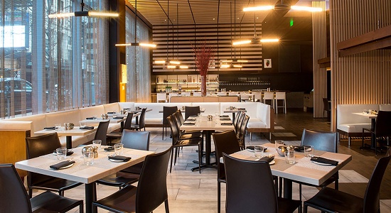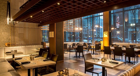 The mayor was dining in The Gallery at the W Boston Hotel at 100 Stuart Street in Boston. Since the restaurant sits on the corner of Stuart and Tremont, it's directly across from the Wang Theater (aka Stonebook Theater). You can actually glimpse it behind Erin outside the window in the second shot above.