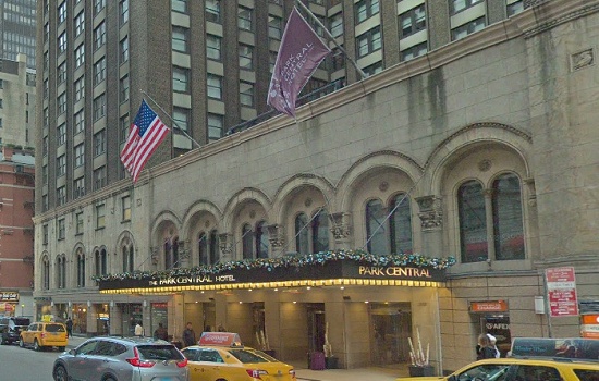 He's on 7th Avenue in Manhattan, starting at West 57th Street and then going past the Park Central Hotel at 870 7th Avenue.