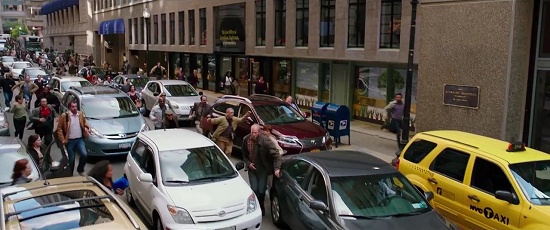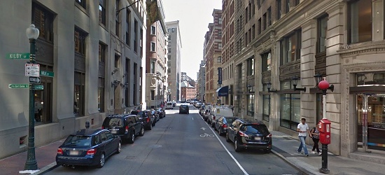 This shot is interesting. The location is actually at 1 Oliver Street in Boston, but the filmmakers altered the footage greatly. As you can see in the real life photo below, the "office building" on the right is actually a bank and a parking garage!
