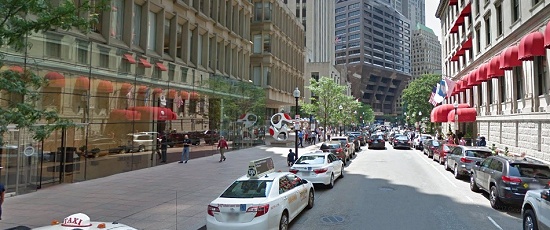 The roadblock is in front of 22 Batterymarch Street in Boston. A sign hanging on a building on the right says "Dobins Square" in the movie, but reads "Liberty Square" in real life. Slimer backs up the car to Water Street. If he kept going, he'd meet up with the cabbie and/or run over Erin in the "alley". He charges through the roadblock and passes Milk Street while hitting some lamp posts. The building on the right of this other shot has a blue awning that reads "Travers Hospital Medical Group, Otavia Health" in the movie and "Harvard Vanguard Medical Associates, Atrius Health" in real life.
