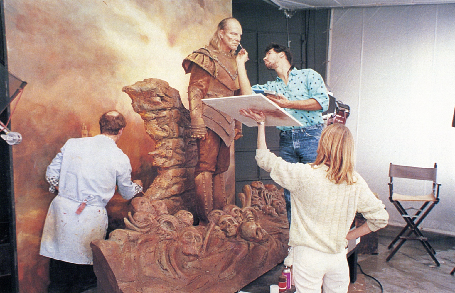 Wilhelm gets made-up while standing in the painting set at ILM.