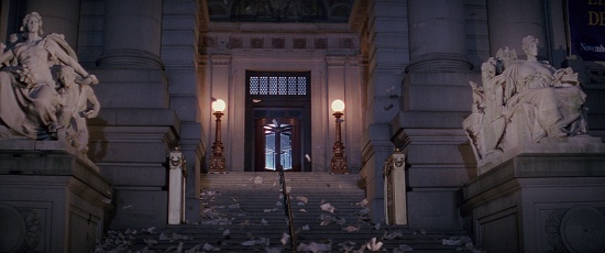 Hard to believe, but this is actually one of the most notable filming locations of the first movie. The woman is standing outside the Fifth Street entrance of the Biltmore Hotel at 506 South Grand Avenue in Los Angeles, California. Yes, the place that doubled as the Sedgewick Hotel was reused for this quick scene. Again, for some reason, Ivan decided to hide the fact that it took place in a famous Ghostbusters location.
