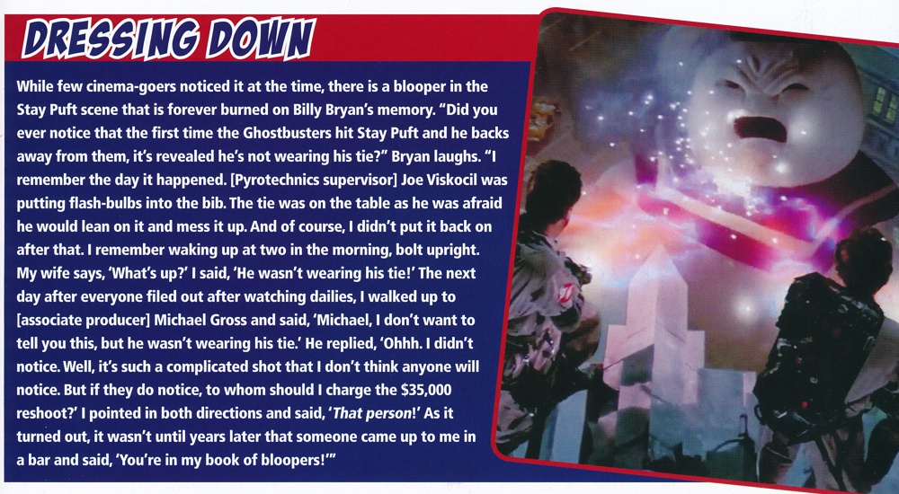 • ANY SIGNATURE WILL DO - Ghostbusters jumpsuits are profiled, and page 52 shows a photo of one with "Bill Murray" written on the tag. The caption says that it was "autographed" by him. That's not his autograph. It's his name written by the costume designer to keep track of whose costume is whose.