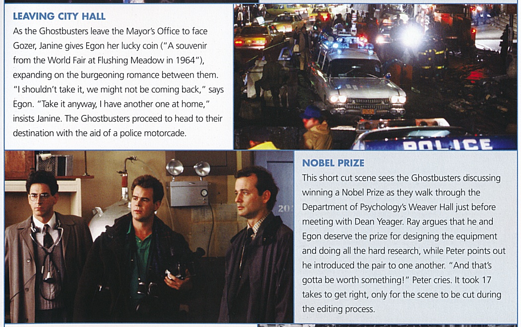 - LEAVING CITY HALL - This is the scene where everyone gets ready on the City Hall Loading Dock, and Janine gives Egon her "lucky coin". You wouldn't know that from the photo accompanying the description, which shows the parked Ecto-1 (hood emblems erased) outside the Shandor Building, with chaos all around, while the guys are up on the roof.