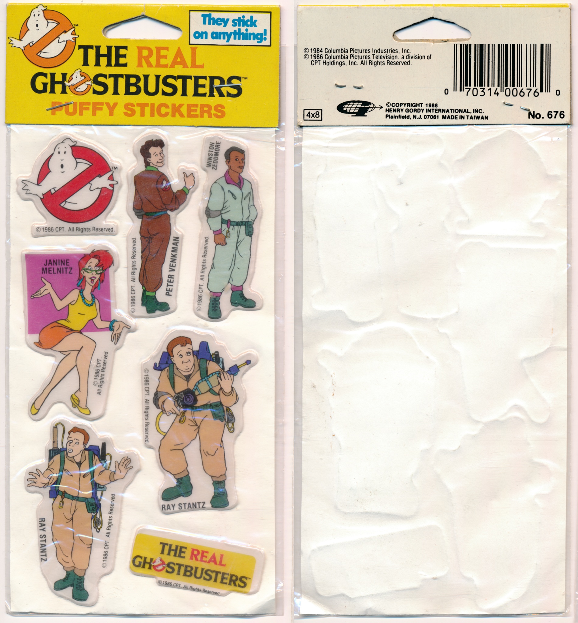 Made by Henry Gordon International, Inc. (HGII) in 1988, this sticker sheet is brand new and still sealed in its original packaging. I'm happy that they included Winston, and absolutely THRILLED that Janine is there, too. I do wonder why Egon is missing. Surely, he could have been included in place of the second Ray, who is wearing white lipstick and looks possessed! Well, in addition to this set on a yellow card, HGII released two other sticker sets. One had all four guys, Janine, the logo, and the title on a blue card. The other had two Peters, Winston, Janine, Slimer, the logo, and the title on a green card.