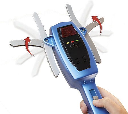 The switch on the handle controls the arms, and the lights and sounds. (Requires two AAA batteries, which are not included.) When the switch is in the lowest position, the arms are down. The middle position makes the arms extend outward, which is "Meter" mode. In the highest position, "Shocker" mode, the arms go straight upwards.