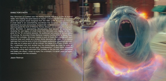The total time is 1:09:57 and, as you can see, the tracks are listed in movie order! That's a HUGE improvement over Sony Classical's previous score albums for Ghostbusters and Ghostbusters II. The track names might be considered a spoiler to some, but at this point, I doubt there's anyone left who wants to see the film that hasn't already. It's also interesting to note that Track #8 is titled "Culpable", but in the movie, Gary used the word "liable" instead (after opening the trap). This makes make wonder if there's an alternate take in which he said "culpable", or if that word was originally scripted, and it was changed to "liable" while shooting.