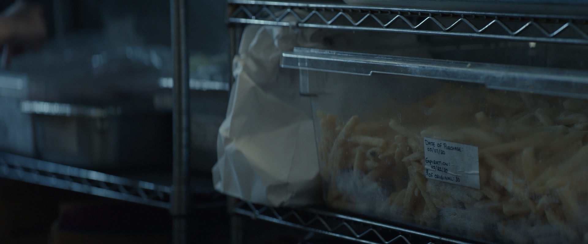 At 22:51 - Trevor (Finn Wolfhard) is working hard - or hardly working - in the freezer at Spinner's. The shot starts on a close-up of a tub of french fries with a handwritten label that reads, "Date of Purchase: 05/07/20 - Expiration: 05/23/20".