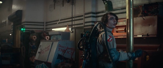 To Ray's statement, Gary replies, "Like, literally scared to death?" Trevor comments, "That's messed up." On screen pops up "THIS YEAR". Callie asks, "So, what is the plan?" Gary tells her, "We're the Ghostbusters. We stay and fight for this place." To that end, we see Trevor, all suited up, sliding down a pole into the firehouse garage bay; while Phoebe is standing there as the Ecto-1 prepares to leave. Ironically, there is a ice machine behind Trevor with the slogan "Don't Forget THE ICE!" on it.