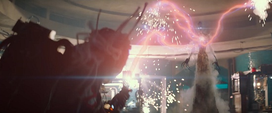 A few quick shots of the equipment, including Winston bucking up his jumpsuit, Janine's new arm-mounted Proton Gun, a Proton Wand, and a Proton Pack with an exposed cyclotron. Trevor firing at Slimer (presumably) in the firehouse third-floor attic. Lars being a dumbass and grabbing the Golden Orb with his bare hands. I thought scientists were supposed to be smart. As for the orb, Dr. Hubert Wartzki (Patton Oswalt) states that it "is prophesizing to bring about the end of humankind." Ray calls it "the second ice age".