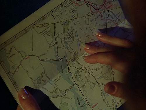 The geography gaffes start right away when Nancy is driving through Manhattan after dropping off her father at JFK airport, which just for the record, is in a different borough of New York City. She pulls out a paper map - remember those? - in an effort to find her way. For a detective, she's not very smart, as she's looking at a map of New Jersey! The Wanaque Reservoir, a lake in New Jersey, is clearly seen in the middle. New York is only a tiny portion in the upper right corner.