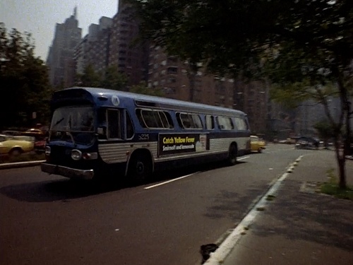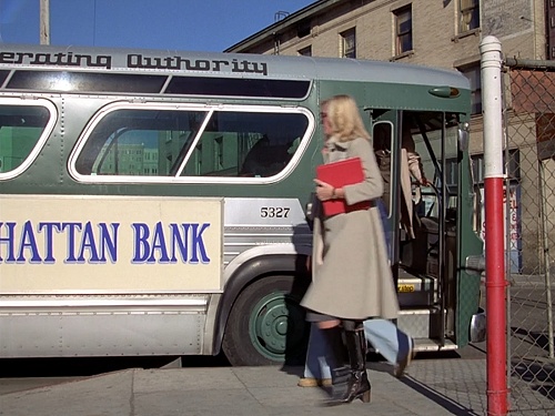 Nancy and her cohorts, which includes a police officer, escape some bad guys by hopping on a passing public bus, which they commandeer. Thank goodness there were no passengers on the bus, or others waiting at stops along the route. It's also a good thing that they never hit a single red light, though that may have been helped by the fact that this is a magic bus. It can seemingly jump around in time and space, as evident by the repeating background footage seen behind them from within the bus. It also has the power to change its appearance. When they board the bus, it's green with a "Chase Manhattan Bank" ad on the side.