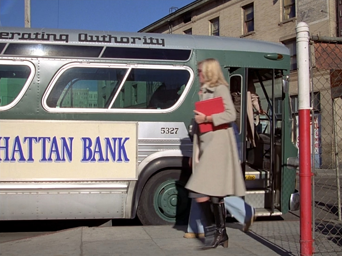 When they arrive at their destination, it's back to being a green bus, with a "Chase Manhattan Bank" ad on both sides.