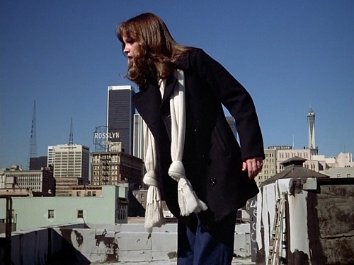 Nancy and Rocky (Karlen) escape the bad guys by climbing to the roof of the Bixby Hotel (433 South Wall Street), which is the building in the back right. Up on the roof, the Los Angeles (not New York) skyline is behind them, most notably the sign for the Rosslyn Hotel. Since Winston Street is right next to the Bixby Hotel, if you pay attention to the background, and know what to look for, you can see the rear side of Fire Station #23, the building that was primarily used as the interior of Ghostbusters headquarters in the original two films.