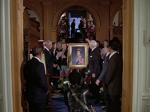 Once the bad guys are carted off by the police, the public reveal of the Queen Elizabeth portrait takes place inside the Greystone. The entrance seen dead center in the background is the same one the Ghostbusters entered through; in the opposite direction, of course.