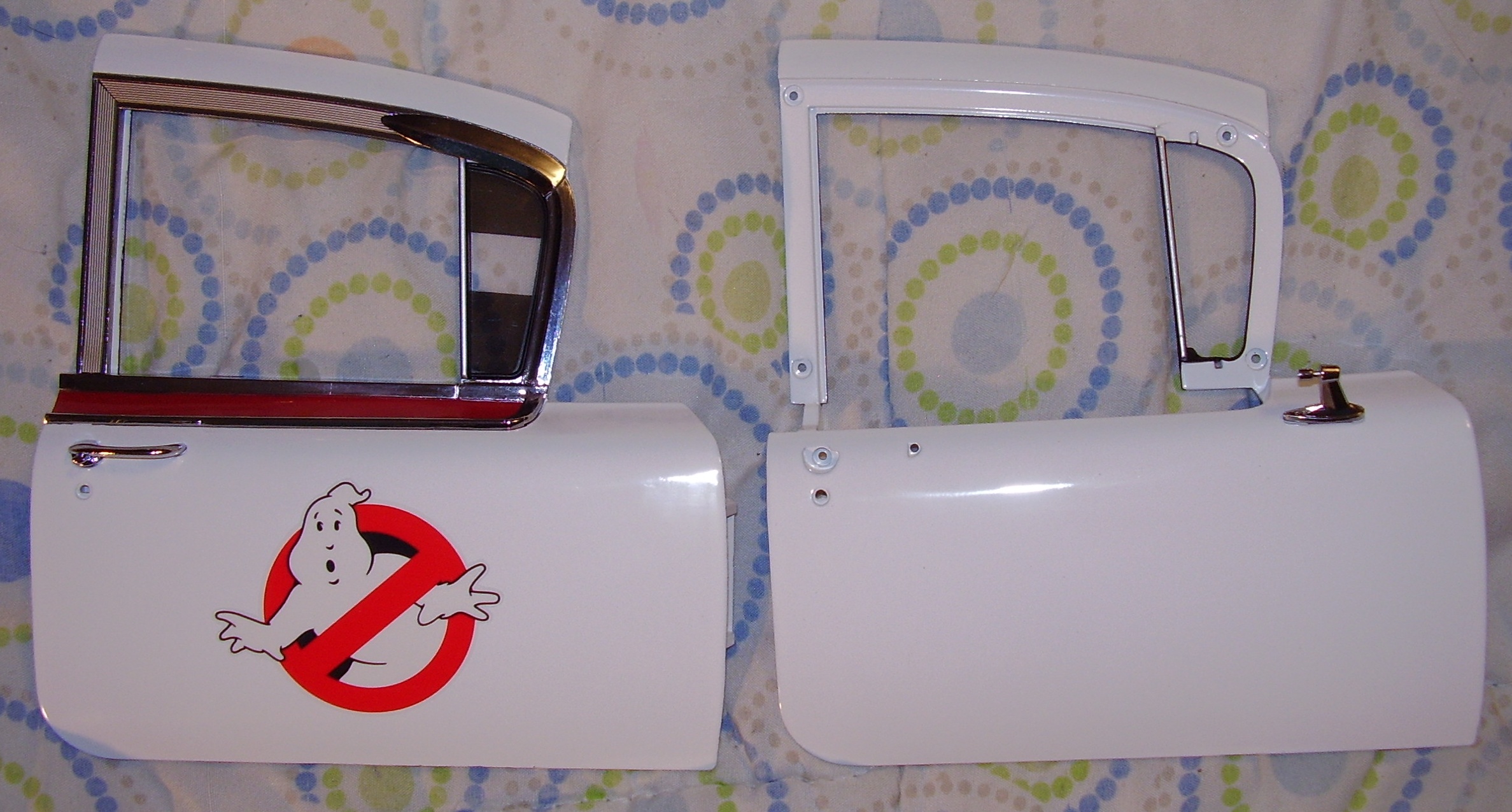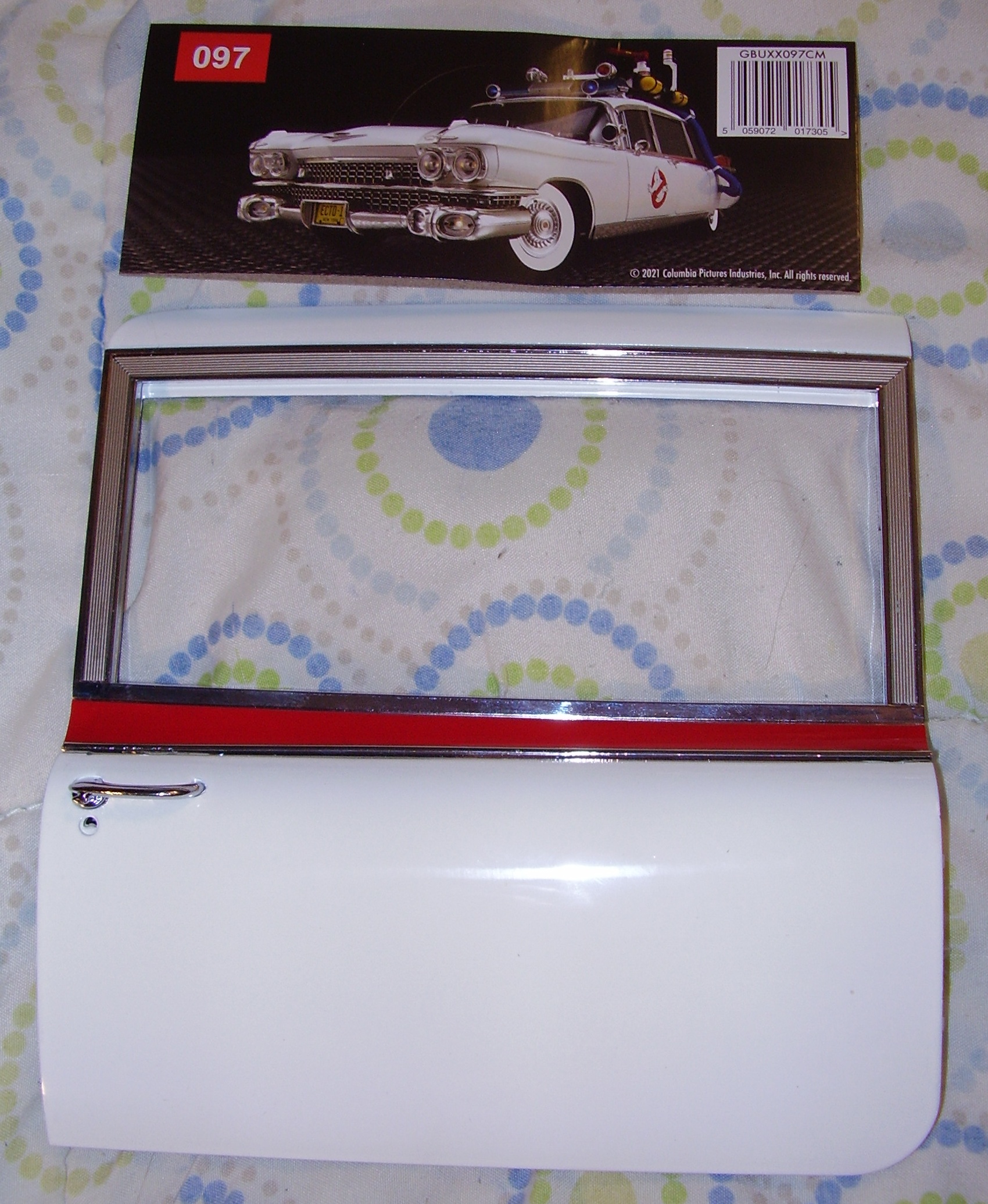 The original right front car door that came with Stage #91 was inaccurate. It has a rear view mirror on it that is not actually on the real car. A corrected door, labeled "#91A", was included with Stage #107. Not only is the mirror gone, but the No Ghost logo sticker now comes pre-applied. Above is the corrected part. Below is a comparison between corrected part (left) and the original part with the mirror attached (right).