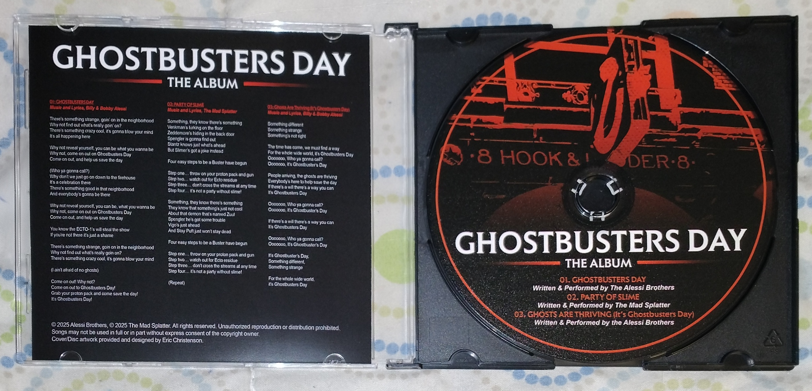 Moving on, let's take a quick look at the CD packaging. I received my copy on April 13, 2026 from Buffalo Ghostbusters headquarters in Amherst, New York, taking just a few days to go from the upper to lower areas of the state. As seen in the photos below, the CD comes in a slim jewel case, which means that there is no back cover insert, and thus, no spine, either. (FYI: All images from here on can be enlarged. The front, interior, and disc images point to my 300dpi scans.)