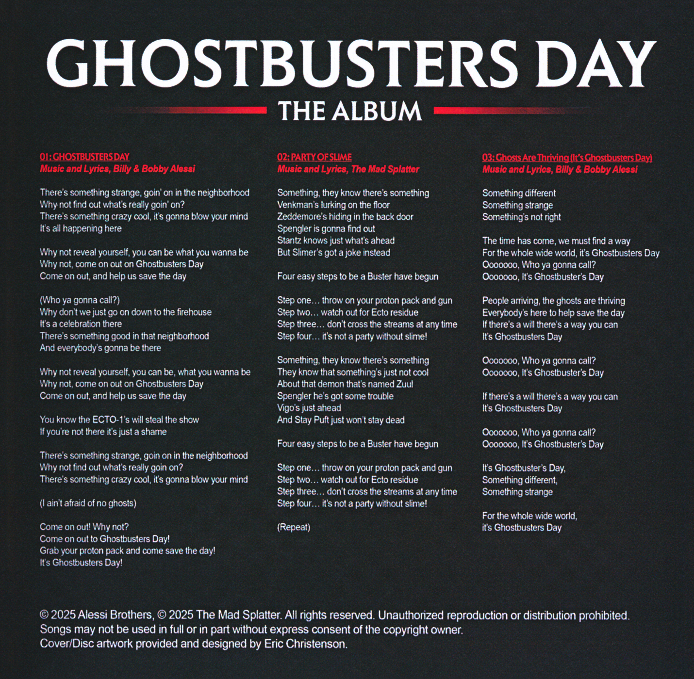 01. Ghostbusters Day - Fellow Long Islanders, Billy and Bobby Alessi, the pop duo behind "Savin' The Day" fron the original Ghostbusters, are back with this easy listening tune dedicated to the annual Ghostbusters Day celebration.