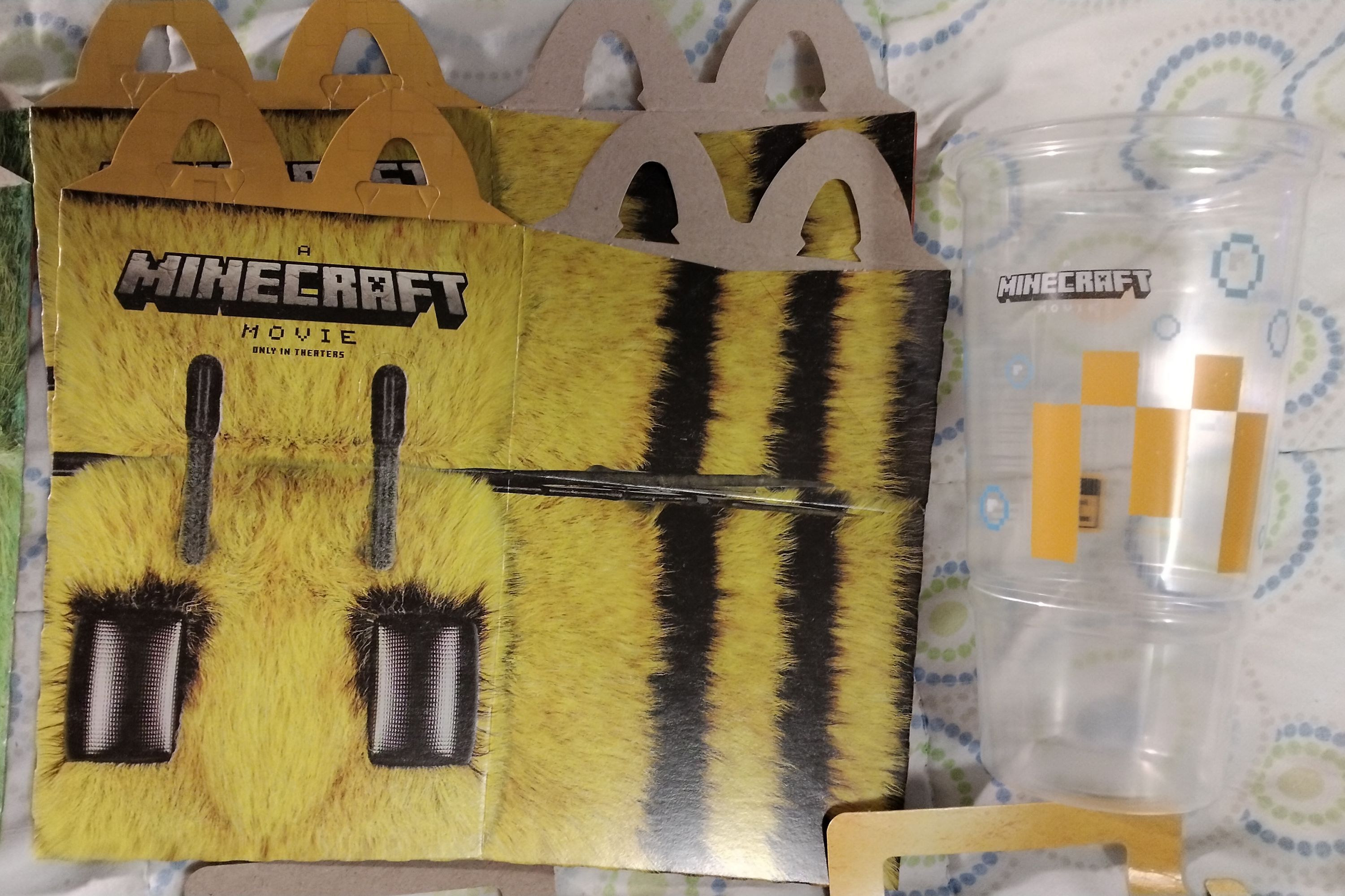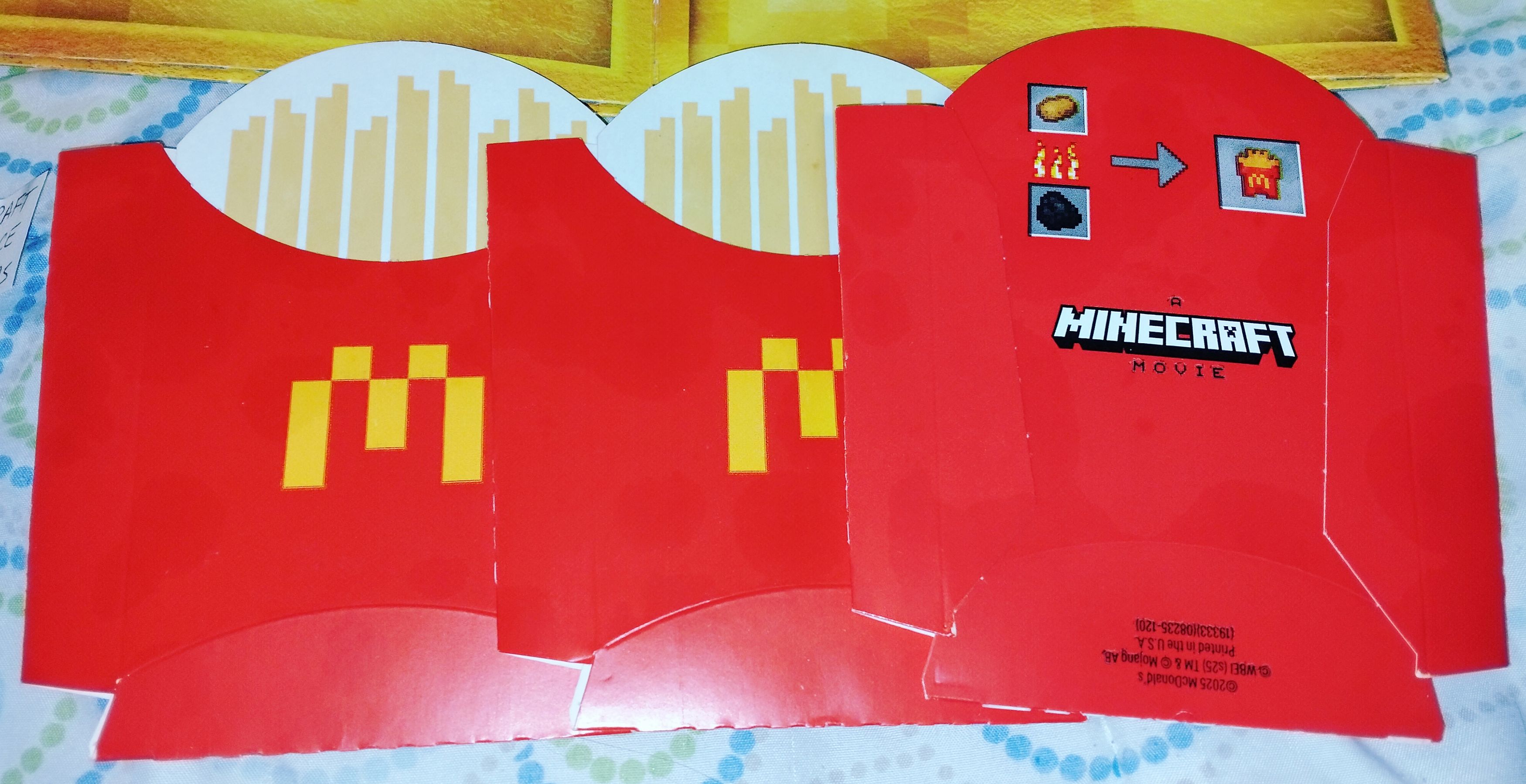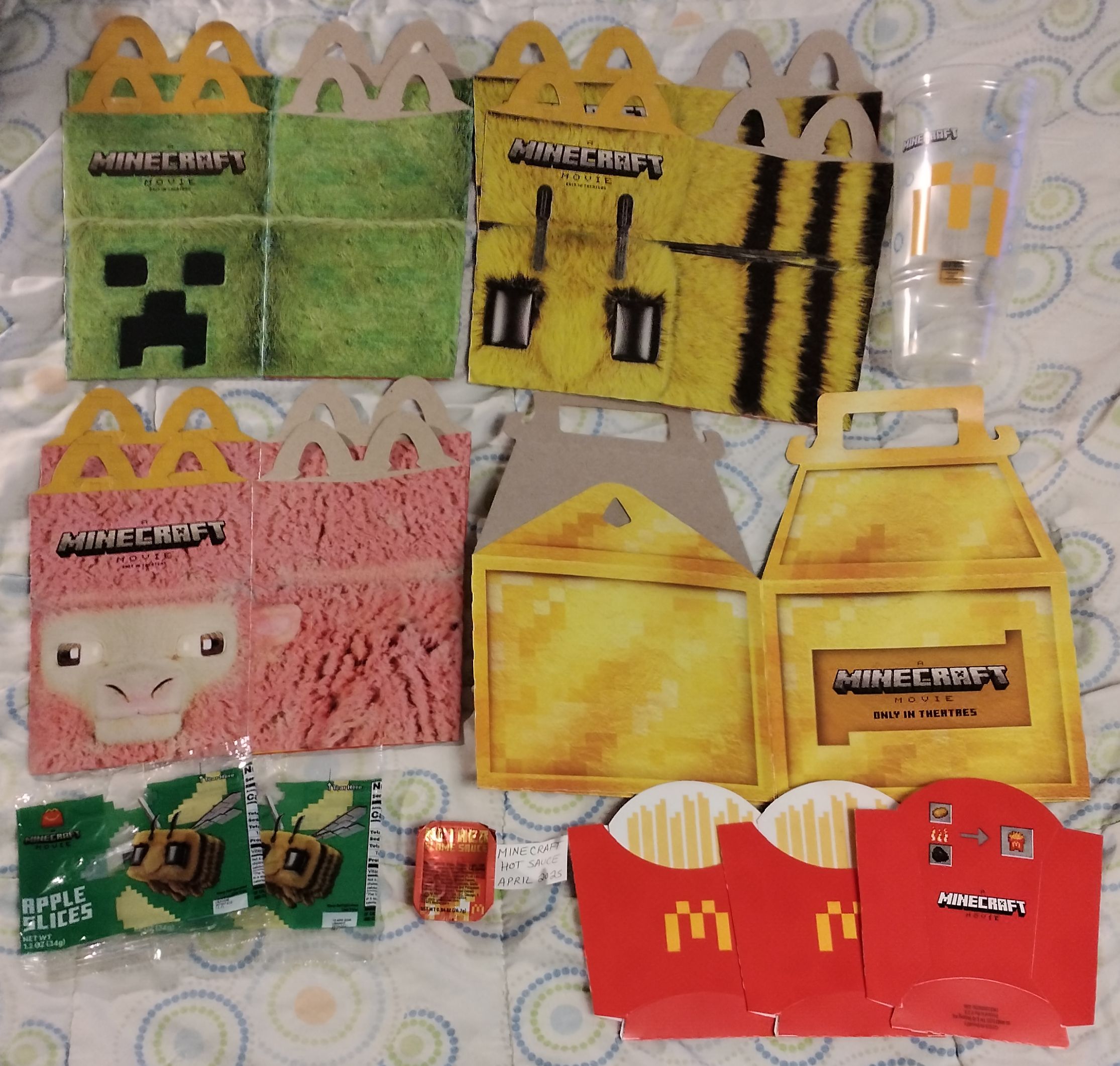 This lot of items from the April 2025 Minecraft Movie promotion includes all three Happy Meal boxes in duplicate (green, yellow, pink), one "Adult Happy Meal" box, one clear plastic cup, two apple slices wrappers, three french fry sleeves, and one SEALED "Ender Flame Sauce" packet. All items, except the sauce packet, have been gently used. Apple wrappers have been carefully cut/opened on the seam on back and washed with soar and water afterward. There might be minor staining inside the boxes and fry sleeves.