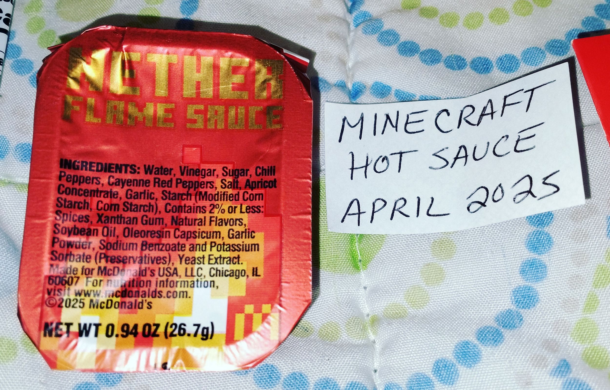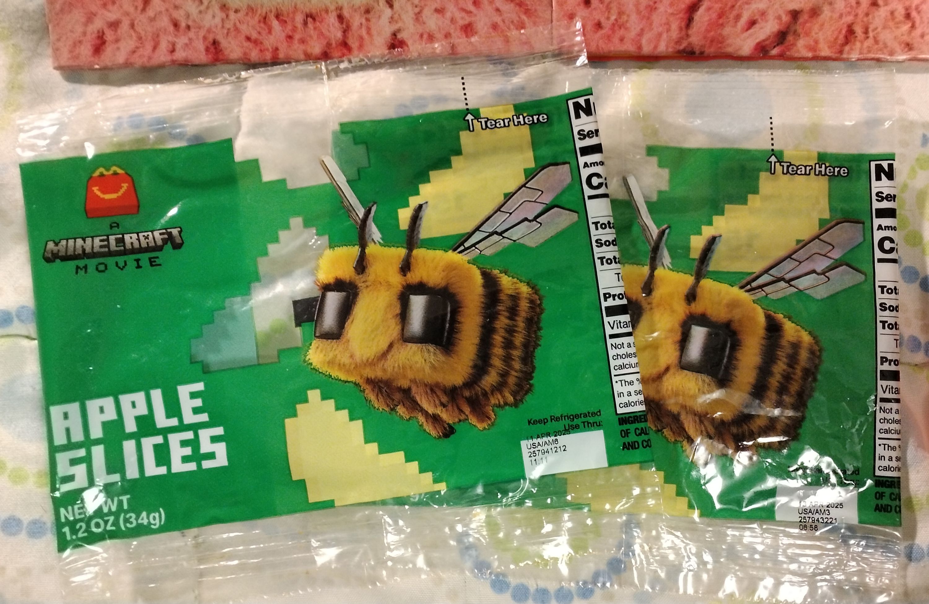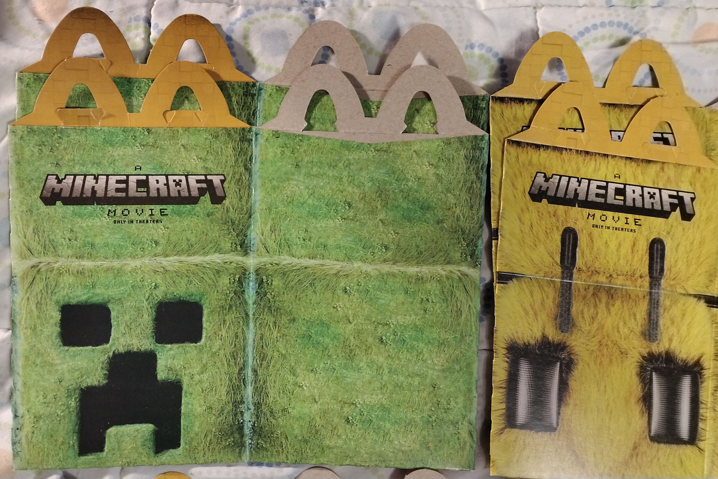 This lot of items from the April 2025 Minecraft Movie promotion includes all three Happy Meal boxes in duplicate (green, yellow, pink), one "Adult Happy Meal" box, one clear plastic cup, two apple slices wrappers, three french fry sleeves, and one SEALED "Ender Flame Sauce" packet. All items, except the sauce packet, have been gently used. Apple wrappers have been carefully cut/opened on the seam on back and washed with soar and water afterward. There might be minor staining inside the boxes and fry sleeves.