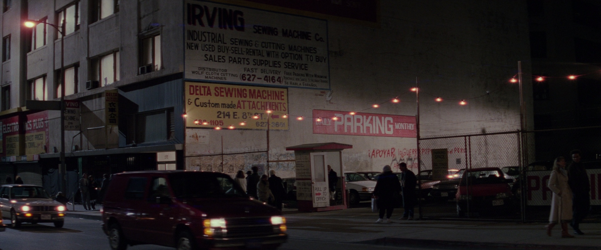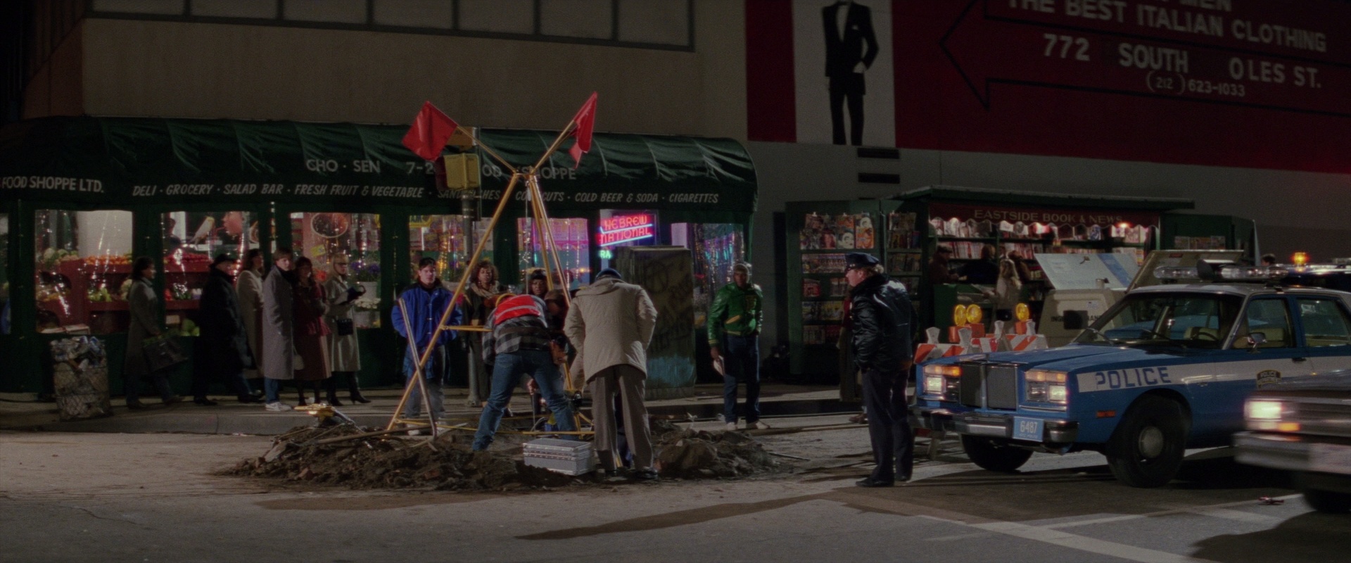 - In the background of the shot of the baby carriage narrowly avoiding getting hit by the bus in N.Y., you can see the green awning of Cho-Sen Food Shoppe Ltd. That green awning, and the hanging dividers that loosely separate the traffic and dust from the produce outside, are a facade, covering up an otherwise boring storefront. That awning was recycled in L.A. behind the road dig. This explains why the awning in the L.A. scene looked so loose compared to a real awning - it was moved to L.A. after the New York shoot and reused to redress a different street. Apparently the Cho-Sen Food Shoppe Ltd. store is meant to help solidify both intersections as being the same, even though everything else at both locations is entirely different. (text written by Chris Stewart)