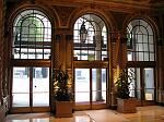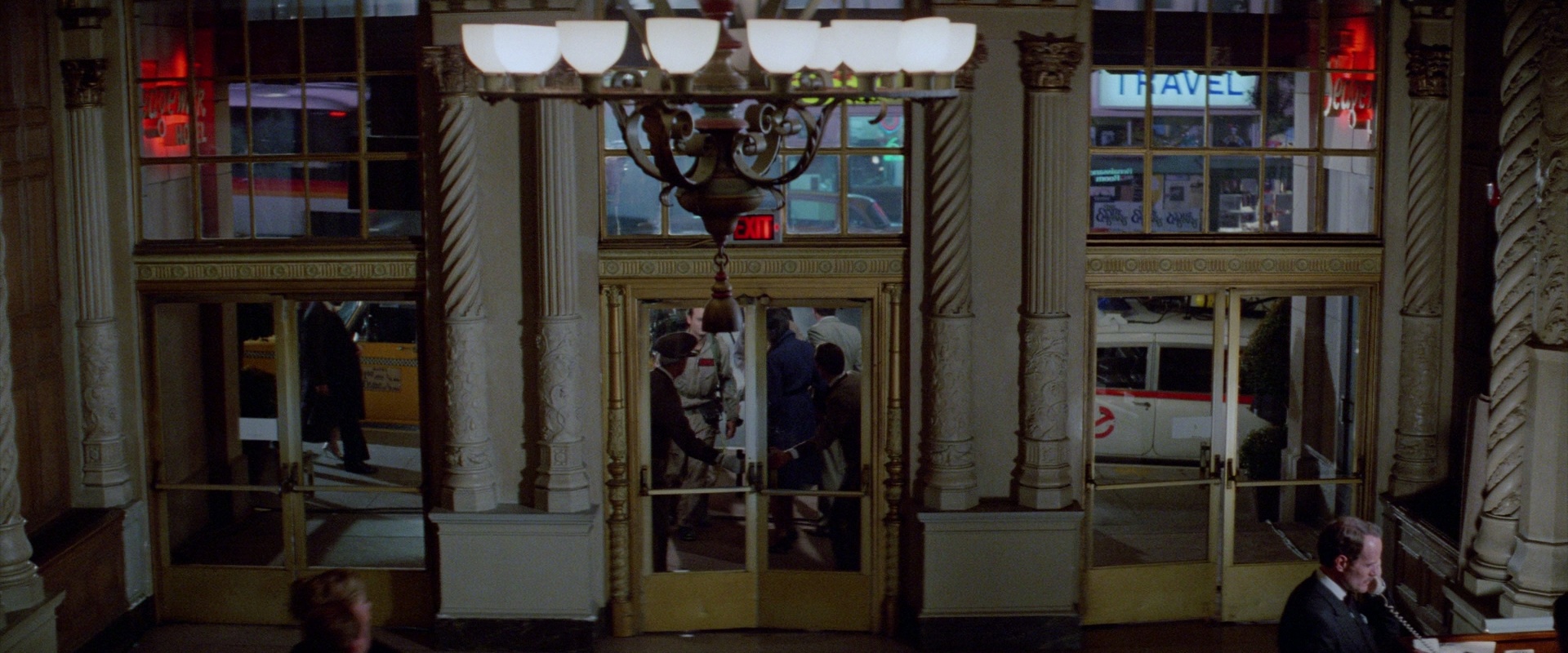 - The Fifth Street entrance that the Ghostbusters went though in the first movie is the location in the second movie where the rich woman steps in the pink slime, thus causing her mink coat to come alive and attack her. According to the script, she's supposed to be in front of the famous Plaza Hotel at 59th St. and Fifth Ave in New York City (the slime was to come spouting out of the fountain in front). The location was not identified as such in the film proper, but her companion played by Douglas Seale is credited as "Plaza Hotel Man" in the end credits. The filmmakers obviously tried to hide the fact that it was filmed outside the Biltmore Hotel, though I wish they didn't, and just had the attack happen outside the Sedgewick Hotel. A quick shot of the entire front of the hotel entrance should have been put in to firmly establish it as the Sedgewick as a nice nod to the first film.