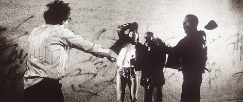 He is staring straight ahead and entirely focused on his destination as the muggers approach and confront him. He stops. They are deliberately blocking his path.