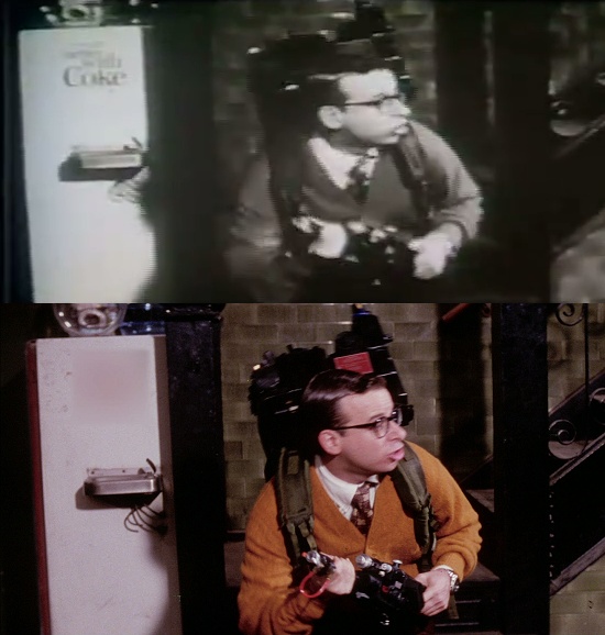 - The "Louis' Secret" deleted scene is edited and contains one blurred logo. As Louis comes down the stairs, there's a refrigerator on the left with a Coca-Cola logo on it, which is blurred on the Blu-ray. The Blu-ray also edits out Louis' "pizza delivery man" line before he turns around and zaps Slimer, and lots more dialog between Louis and Janine at the end of the scene. The full scene was made available by special effect crew member William Forsche as part of a video he uploaded containing all Slimer deleted scenes.