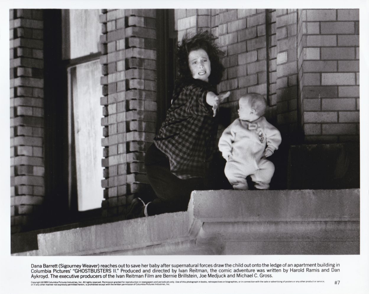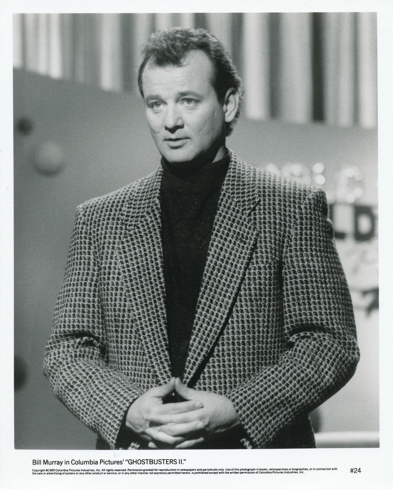 In addition to text documents, a press kit also comes with a few numbered 8x10 b&w glossy photographs. I do not know how many each press kit is supposed to come with, but it probably won't come with the complete set of photos. It seems to me that there are 102 photos in the Ghostbusters II promo photo set, as I've never seen any above that number. My copy of the press kit contains photos #2, #5, #9, and #16. I also own photos #16, #59, #60, #62, #63, #74, #84, #85, #99, #100, #101, and #102. Below is the entire collection of Ghostbusters II promo photos.