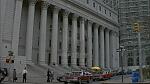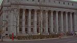 6143-015 Courthouse Pull back of New York City courthouse. Starts with close up of "United States Court House" written on top of building and pulls back to full shot of building. Building is stone with large columns in front. See bare trees in foreground and pedestrians walking on sidewalk. 6143-030 Courthouse Medium angle of New York City courthouse from side angle. See "United States Court House" written on top of building. Building is stone with large columns in front. See cars, buses and taxis passing in foreground. See pedestrians walking in front of courthouse. 6153-016 Courthouse Medium angle of New York City courthouse with corinthian columns and engraving above that reads "United States Court House." Cars drive by from right to left on street. 6153-018 Courthouse Pan down of New York City courthouse with corinthian columns. Engraving above columns reads "United States Court House." 6155-068 Courthouse Zoom in of New York City courthouse to engraved sign above that reads "United States Court House." Corinthian columns, cars drive from right to left in front of courthouse. |