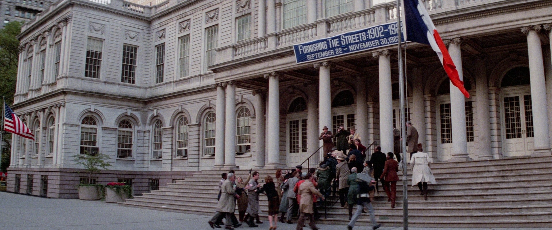 During the chase near the end of the film, they drive up near City Hall. The movie is available on 20th Anniversary DVD and Amazon Instant Video. (Frame grab by Matthew Jordan.)