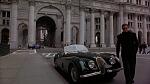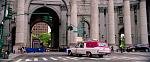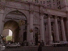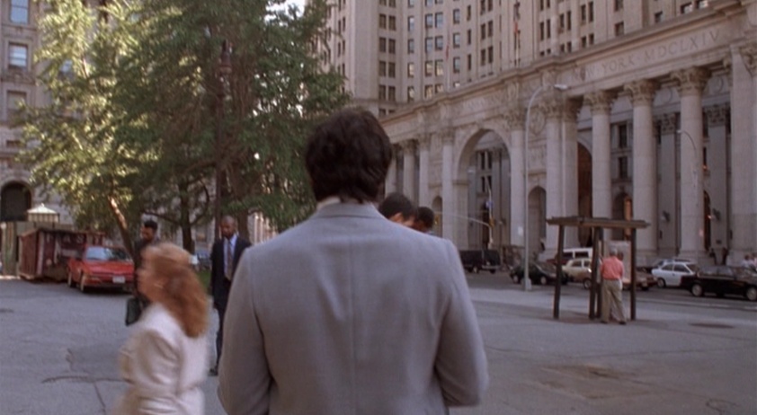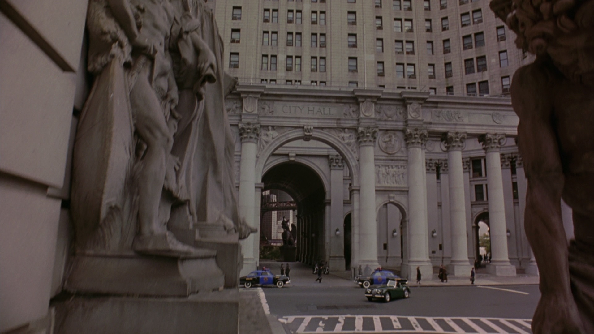 Bruce Wayne goes to visit Dr. Chase Meridian at her office. The shot starts on the top of the Municipal building, then pans down to see Bruce driving up to the building (31 Chambers St.) across the street. The word "Manhattan" on the building has been digitally changed to "City Hall", which I guess means that it's supposed to be Gotham City City Hall in the movie. Also, the background area under the arch has been digitally altered to include a gothic griffin statue and some steel beams. (High-resolution Blu-ray frame grabs done by me, Paul Rudoff)
