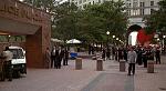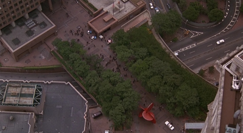 20 Years Later: Where Ecto pulled out is now a guard house and a motorized barricade to allow certain cars in or out. You can, however, walk into the plaza with no problem. Bernard Rosenthal's "Five In One" sculpture (see Fun Facts) is now painted red.