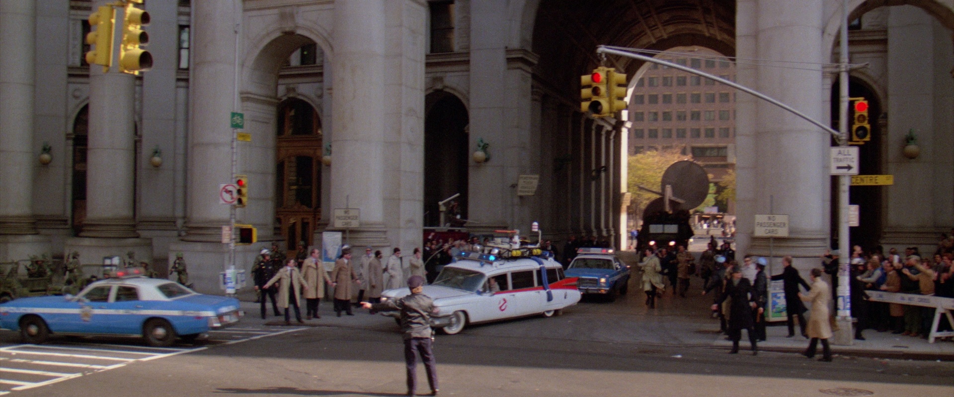 Paul Feig's ill-fated parody remake features a few locations from the original movies. The Municipal building actually pops up three times. First you see the back of it as the camera pans down to the new Ecto-1 driving past 60 East Broadway enroute to the Stonebrook Theatre. (This instance is not shown below.) A few seconds later the car turns the corner right in front of it. Later on, when the Ghostbusters are taken to City Hall to meet with the Mayor, the back of the building is shown again as an establishing shot.