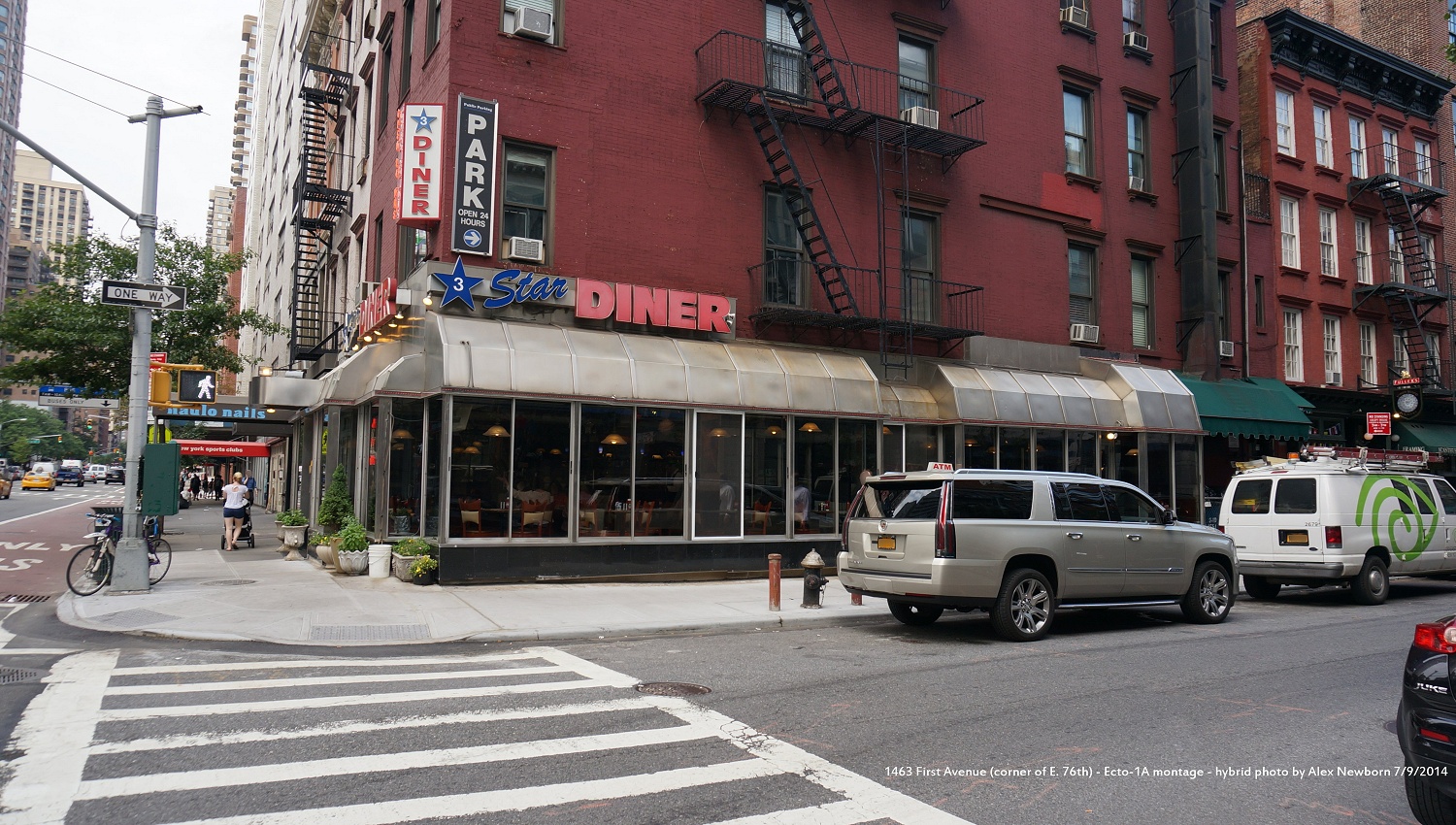 Ecto-1A Montage Shot 3-Star Diner 1463 First Avenue (corner of E. 76th St.) New York, NY 10021 * Google Maps street view Louis' Bus Stop First Avenue between 76th and 75th Streets * Google Maps street view |