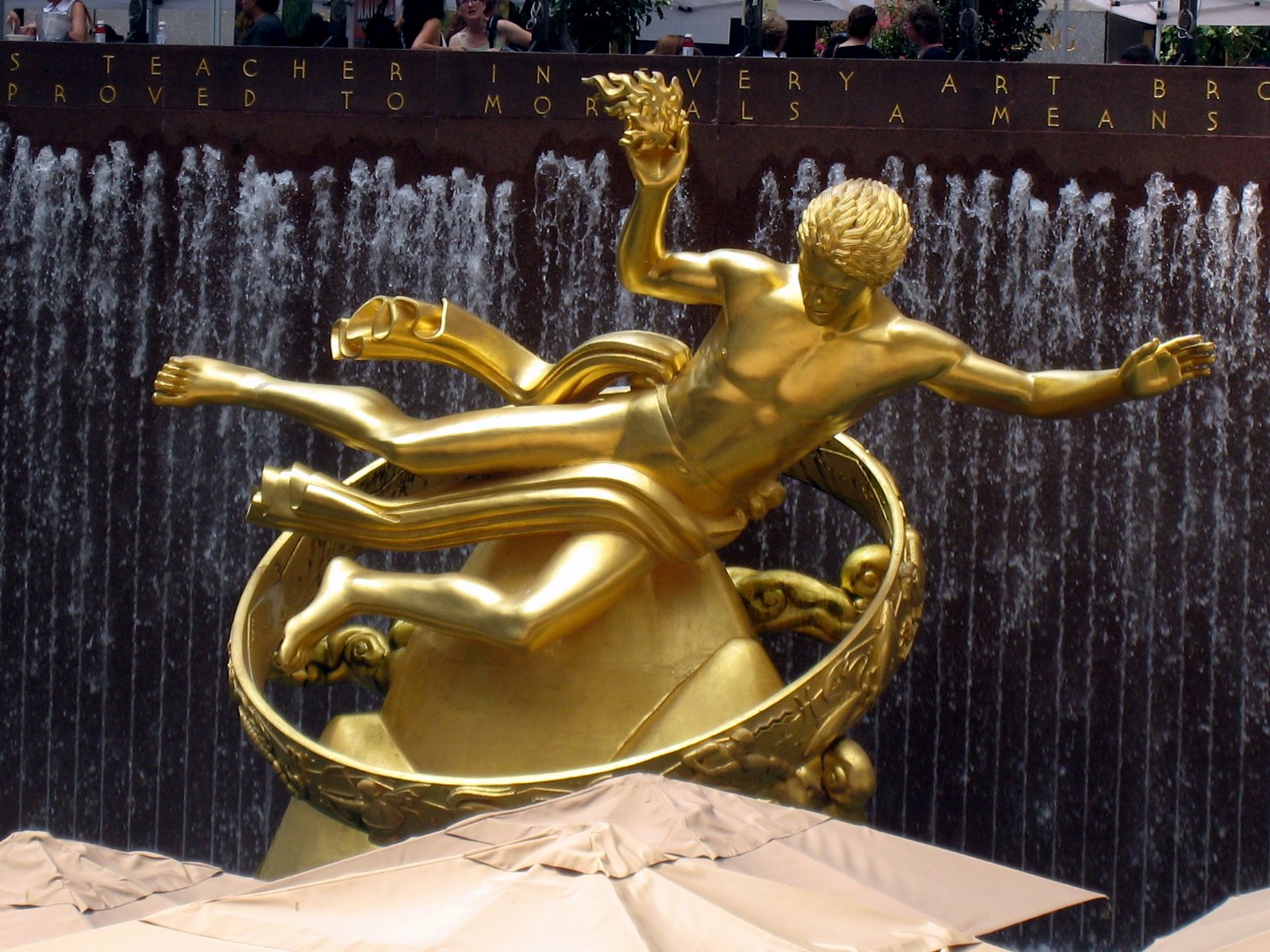 The Outdoor Plaza serves as both an outdoor dining and bar area as well as a skating rink during the colder months. These are the remnants of plans to turn it into a subterranean shopping mall connected to most forms of mass transit. Inspired by the open squares of European cities, the plaza was designed as a focal point for the Metropolitan Opera development planned in 1926. But these plans fell through and the rink was opened in 1936, the year of the first Rockefeller Center Christmas Tree. At the other end of the plaza stands the bronze statue covered in gold leaf designed by Paul Manship atop a large fountain. It's of the Greek mythological figure Prometheus stealing fire from the gods and giving it to man, bringing them knowledge and the arts.