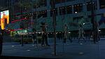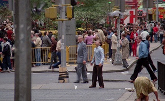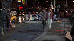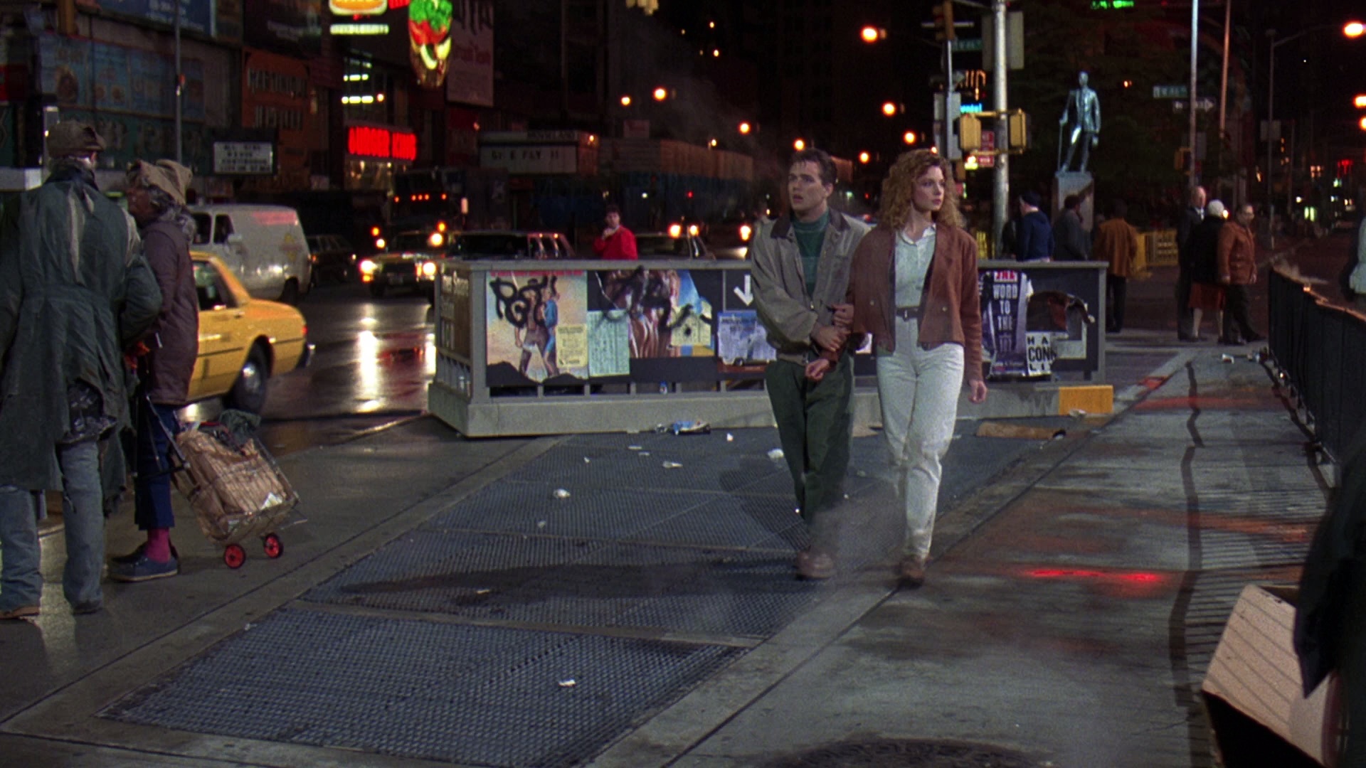 The subway entrance in the middle of Times Square that the teens come out of doesn't exist. It's a prop placed there by the film crew. You'll notice that it's right over some metal grating. In the beautiful sweeping crane shot of Times Square that opens the scene, you can see the McDonald's that used to be WienerWald and the George M. Cohan statue that Louis wandered past in Ghostbusters, while on the other side of the street you can see the Movieland theater (hidden in the background to the right of the Burger King) that the ghost came out of in Ghostbusters II. In the reverse angle shot of the teens walking away, you see on the left a little bit of the decorative construction from One Broadway Place, which was seen in the background on the left of the Ghostbusters II shot. You see more of the decorative construction sign at the very end of the film when they reunite with the dog.