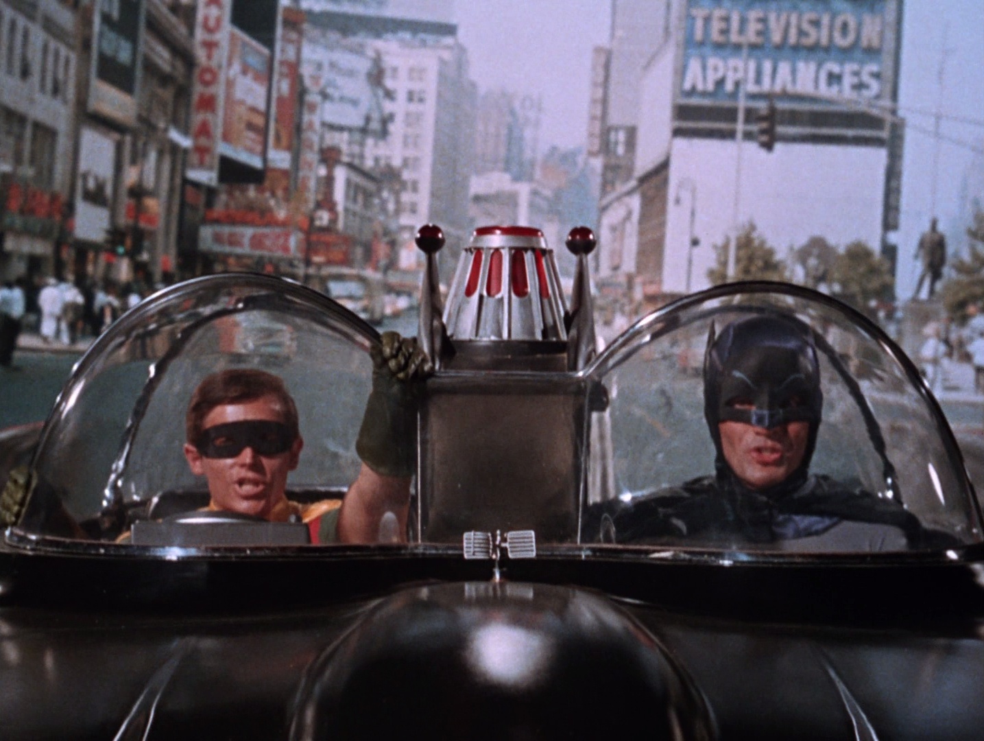 Through the magic of rear-projection photography, Batman and Robin drive down Broadway through Times Square, though it's supposed to be the streets of Gotham City. The pass by the Forum theatre (left side of frame) which is advertising the 1961 film The Sky Above, The Mud Below on its marquee. This theater would later become Movieland when the Ghostbusters II theater ghost scene was filmed there. Next door is the Automat that would later become Burger King in the 1980s (it's a huge souvenir shop as of 2015). On the right side of the screen you can see the George M. Cohan statue that Louis wandered by in Ghostbusters. (High-resolution Blu-ray frame grabs done by me, Paul Rudoff)