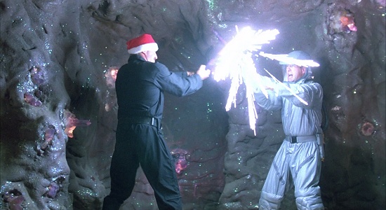 Santa With Muscles is presented in a 1.85:1 aspect ratio with a runtime of 1:37:40. On the audio side, there is only an English DTS-HD Master Audio 2.0 track. The subtitles, which are available in English only, have a few errors. There are numerious spots where it says "mumbles" because the transcriber couldn't figure out what was being said, even though a few times it's quite obvious what the words are. That said, the subtitles get the job done and I applaud Mill Creek for continuing to have them on their releases (which wasn't always the case). As is the case with most Mill Creek Entertainment releases, there are no bonus features. A digital copy code voucher is also included in the standard one-disc Blu-ray case, which is redeemable on Mill Creek's MovieSpree website.