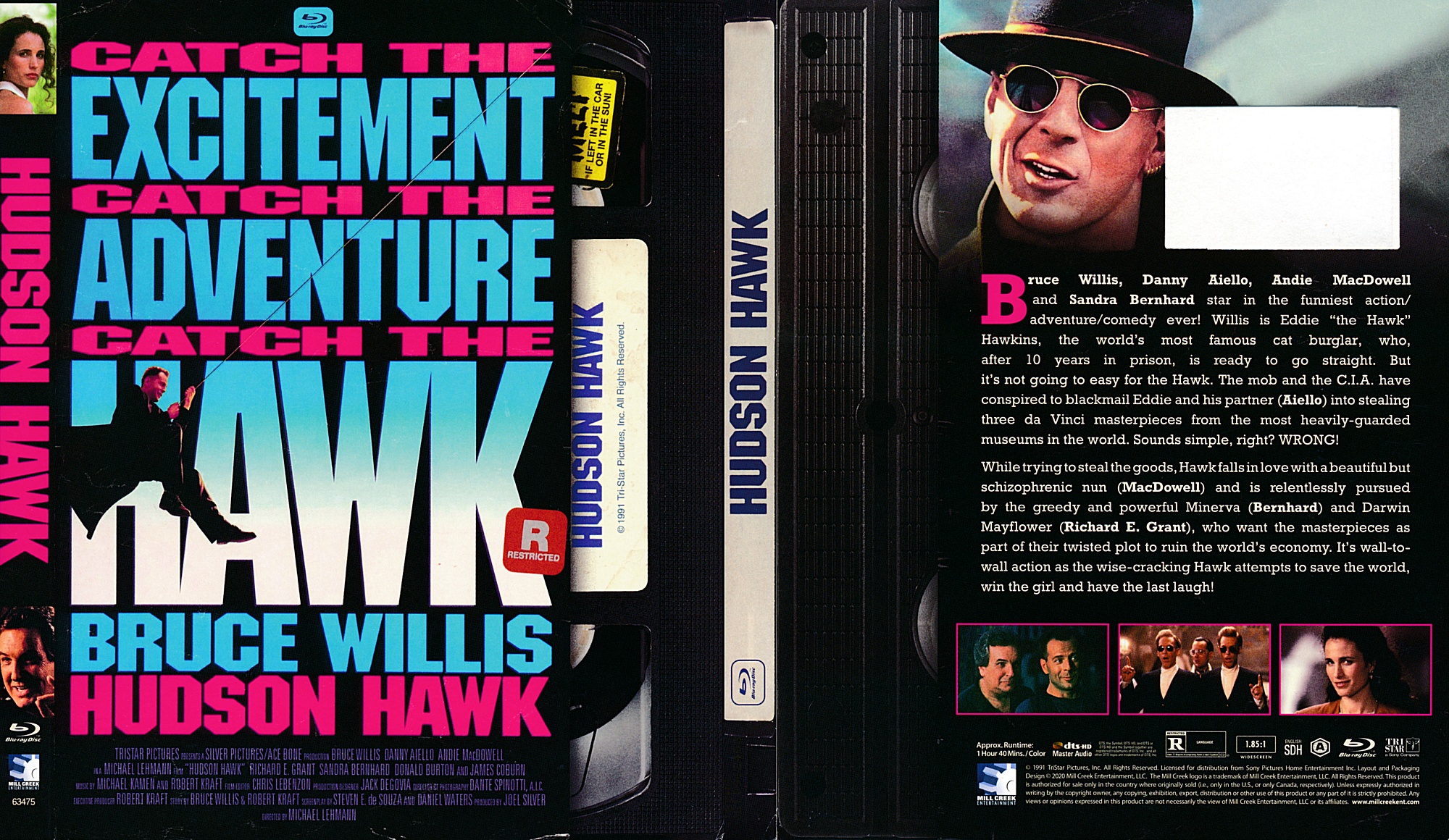 Hudson Hawk arrives on Blu-ray as part of Mill Creek Entertainment's Retro VHS Style series, with packaging designed to look like the VHS videocassettes of the 1980s and 1990s. Several other titles in the series have already been reviewed on The Corner Penthouse, and I'm always excited when Mill Creek announces more. It's fun to see if it's a title I used to own on VHS, or one whose trailer I remember seeing at the start of some other VHS tape, or even some obscure movie I've never heard of before.