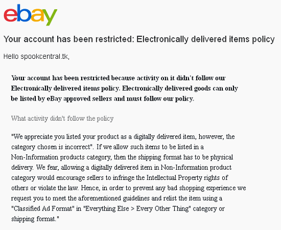 On November 2, 2020, I received an e-mail from eBay claiming that my "account has been restricted because activity on it didn't follow our Electronically delivered items policy. Electronically delivered goods can only be listed by eBay approved sellers and must follow our policy."