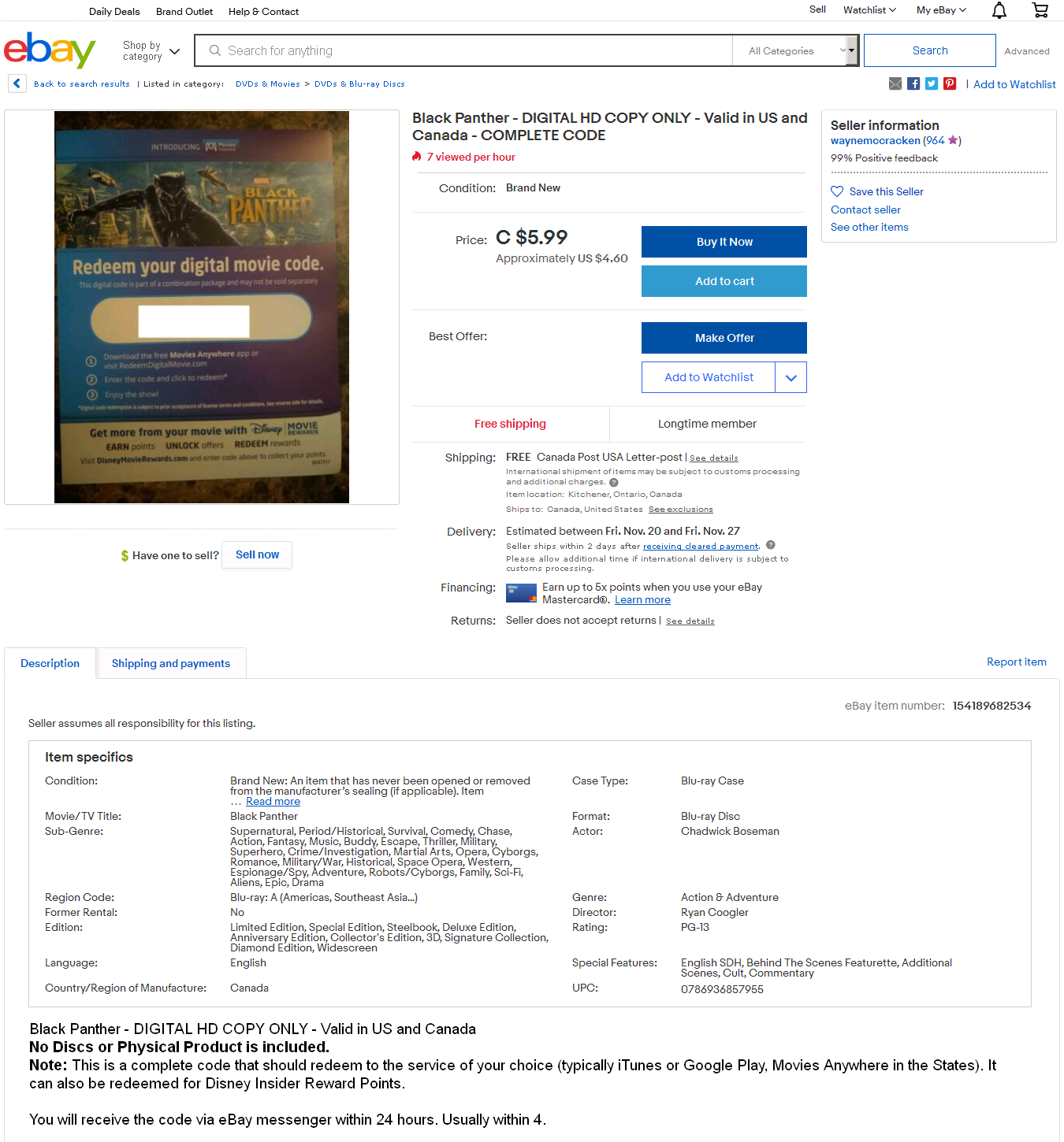 As you can see in the screenshot below, the Black Panther code listing clearly states that "No Discs or Physical Product is included" and that "You will receive the code via eBay messenger within 24 hours."
