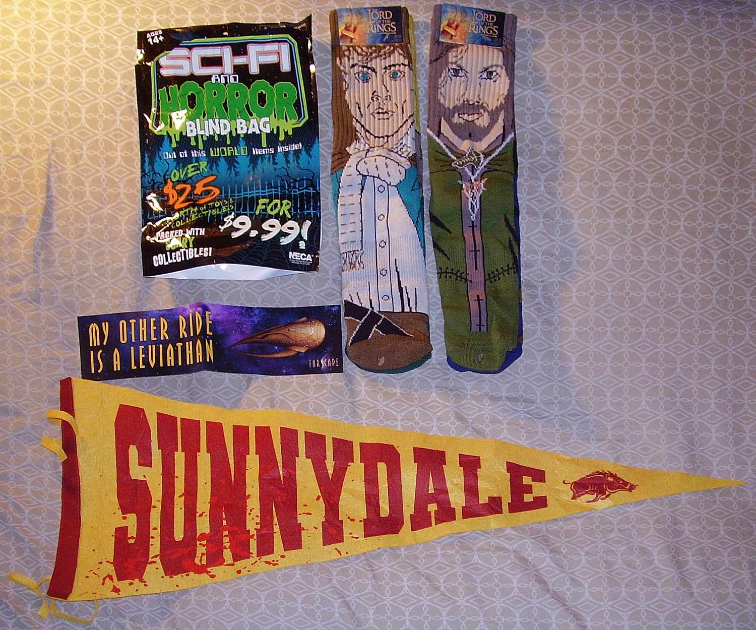 I'm thrilled to get another pair of socks. The pennant is nice, but I'm not a Buffy fan, so I'll pass it on to someone else. I don't have a car, and have zero interest in Farscape, so that will be passed on, as well.